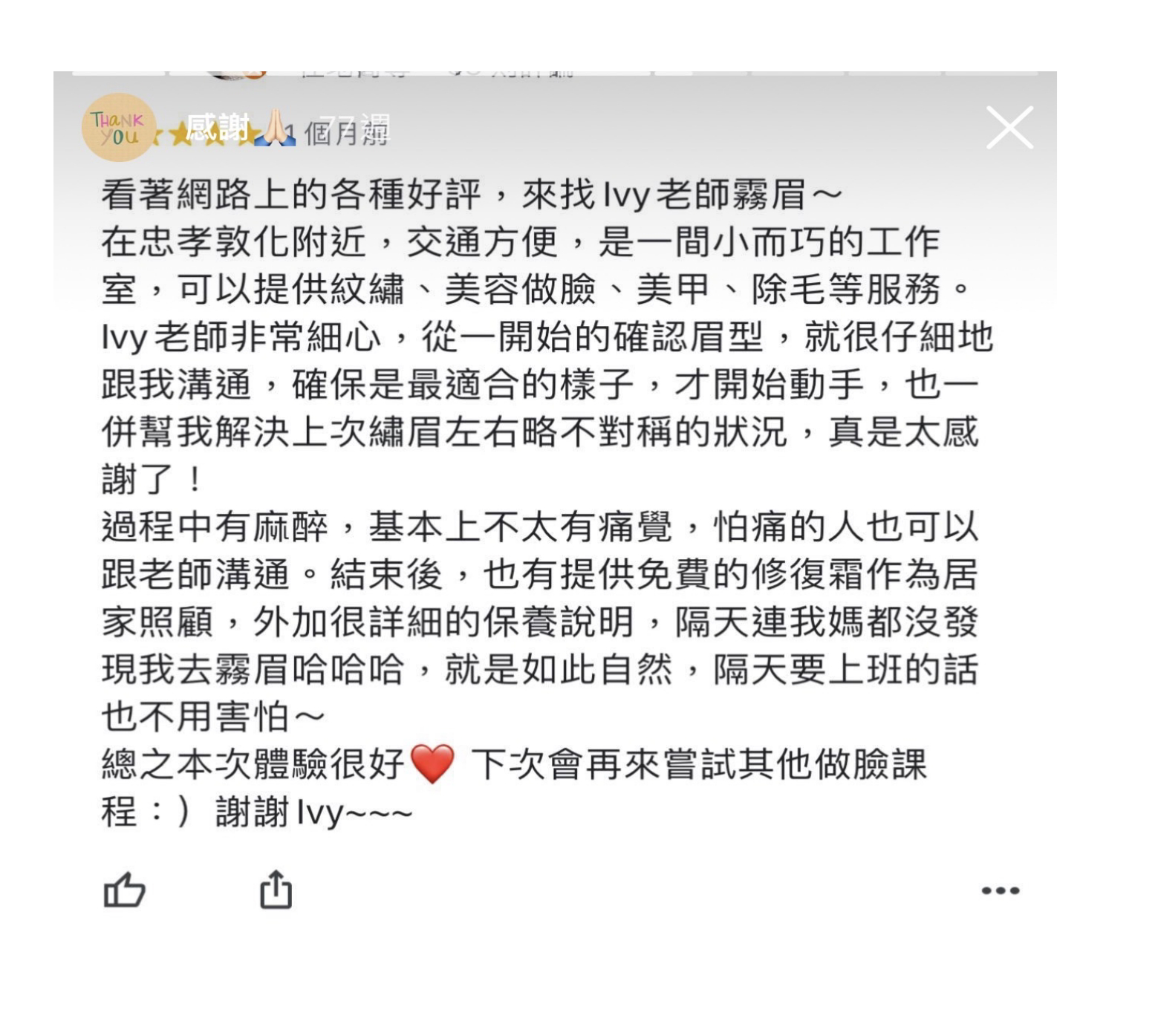 IVY是以這樣的心態來為各位服務,只做有效果的保養,愛美麗,也就是更愛自己,心情愉悅至上溫暖開放空間分明的環境,陽光灑落,望外眼入大樹,讓您感覺到像是回家保養,舒服及安心,19歲進入美業職場,16年不斷的提升自我,謝謝大家的愛戴與支持是我的動力,看著大家變美是我的成就,IVY是帶著這樣的心情面對你們,面對「美」的事物